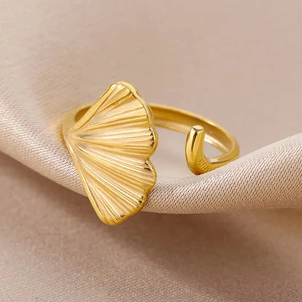 Anillo de hoja de ginkgo biloba de acero inoxidable plateado y dorado
